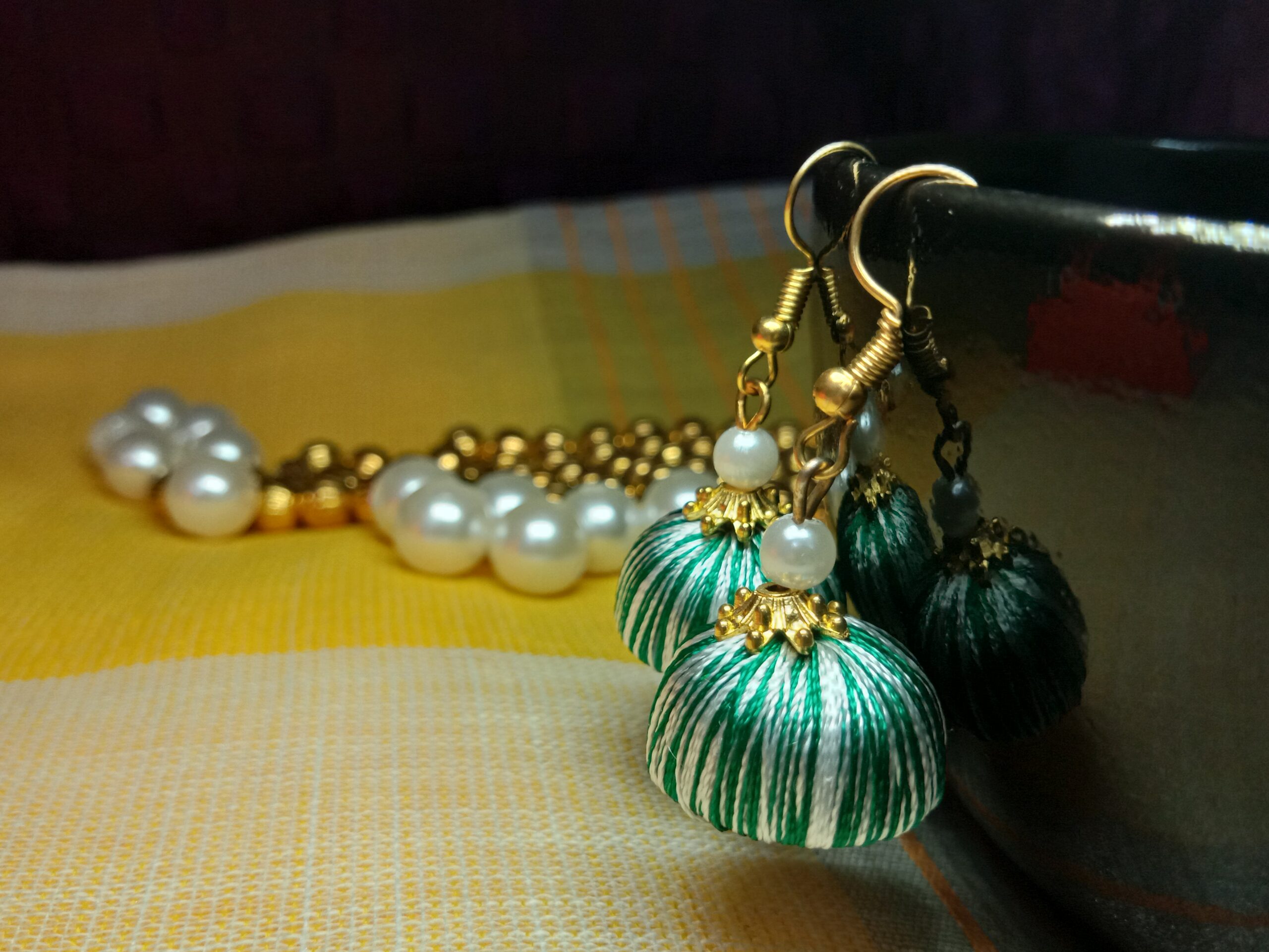 Be the first to review “Green and White Silk Thread Small Size Jhumkas with acrylic cap”