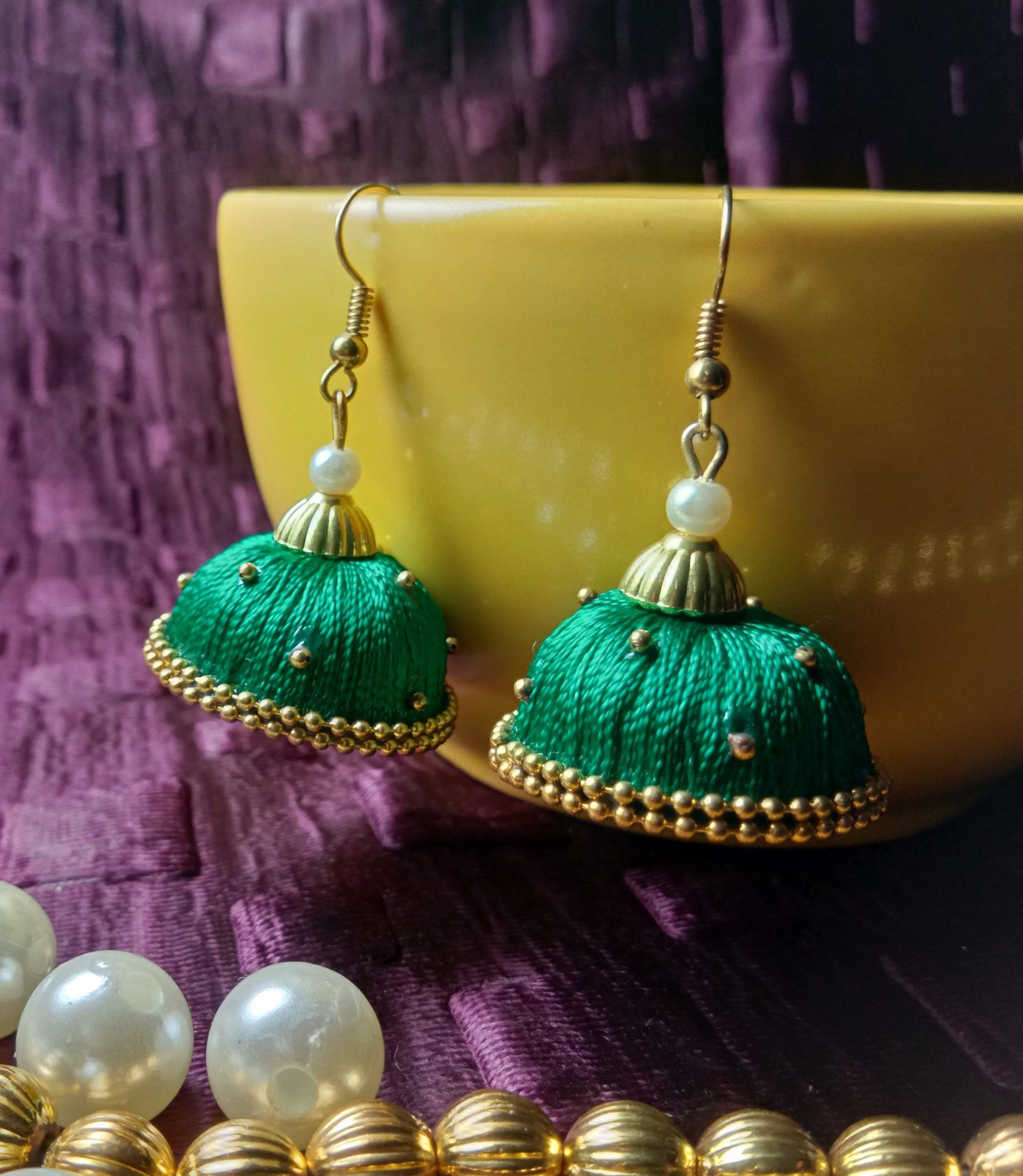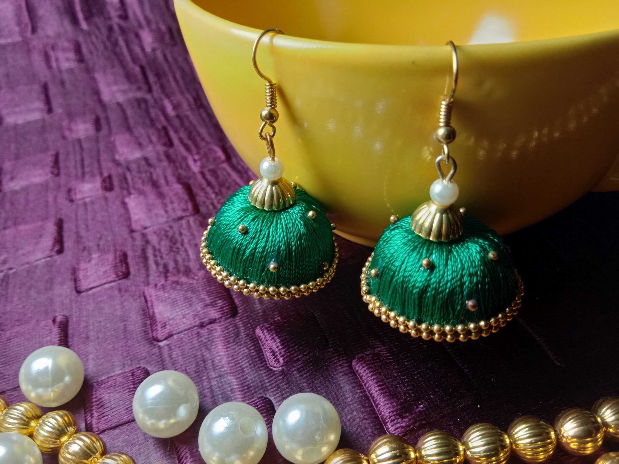 Be the first to review “Green Silk Thread Medium Size Jhumkas With Double Golden Lace with Gold dots”