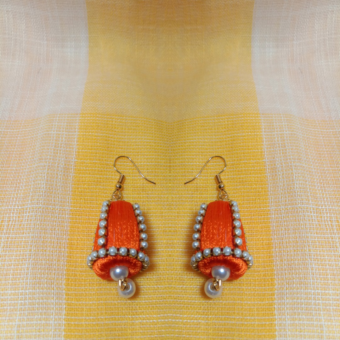 Be the first to review “Orange Silk Thread Cone Shape Jhumka with Pearl and Pearl Lace”