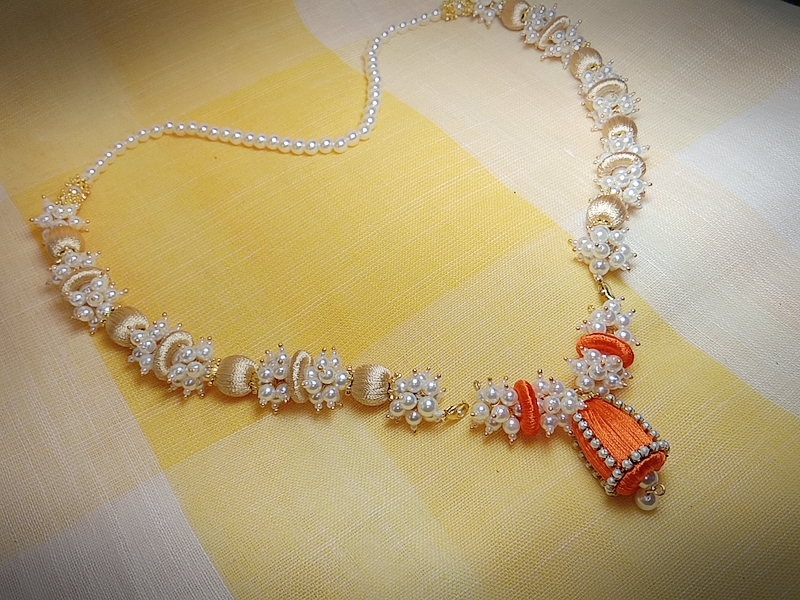 Be the first to review “Orange Silk Thread Loreal Necklace with Cone Shape Jhumka with Pearl Loreal Bunch and Pearl Lace”