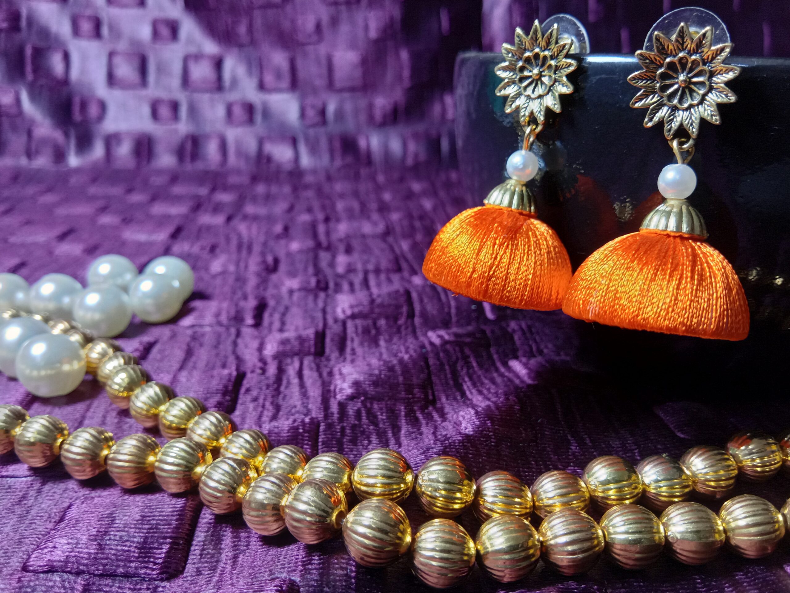 Be the first to review “Orange Silk Thread Medium Size Jhumkas With Metal Flower Shape Brass Stud”