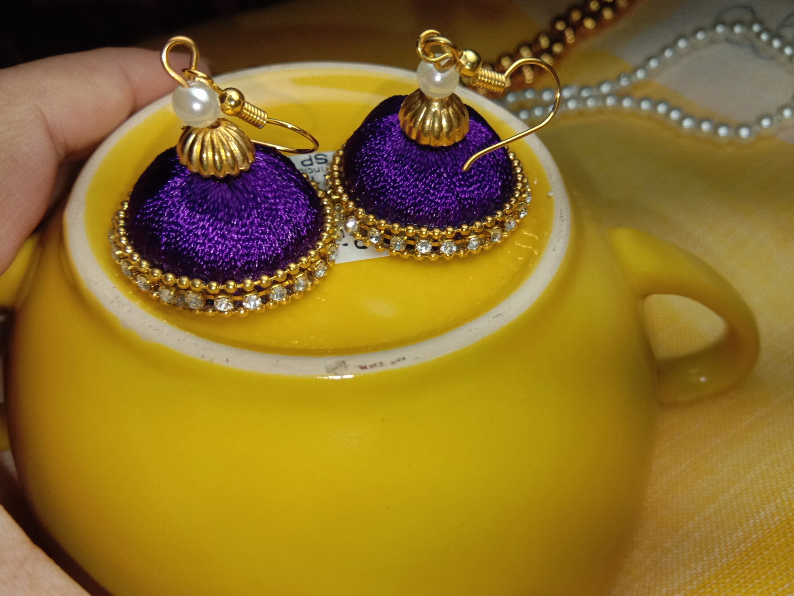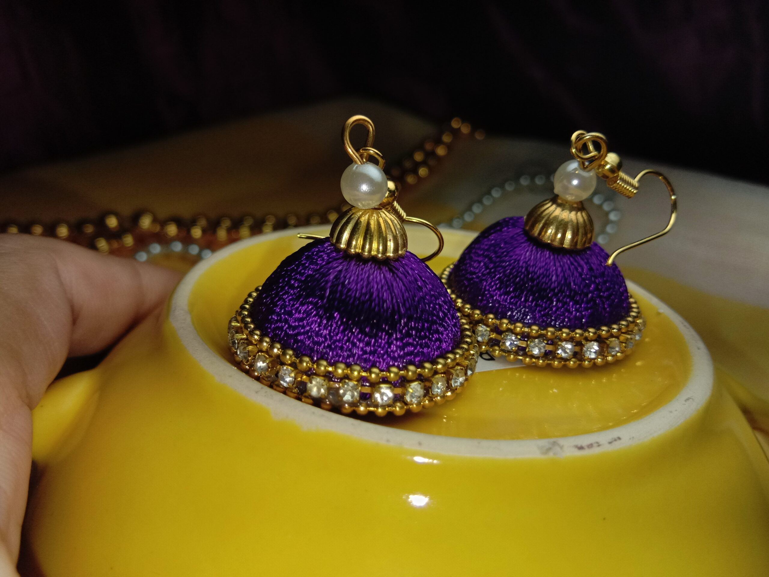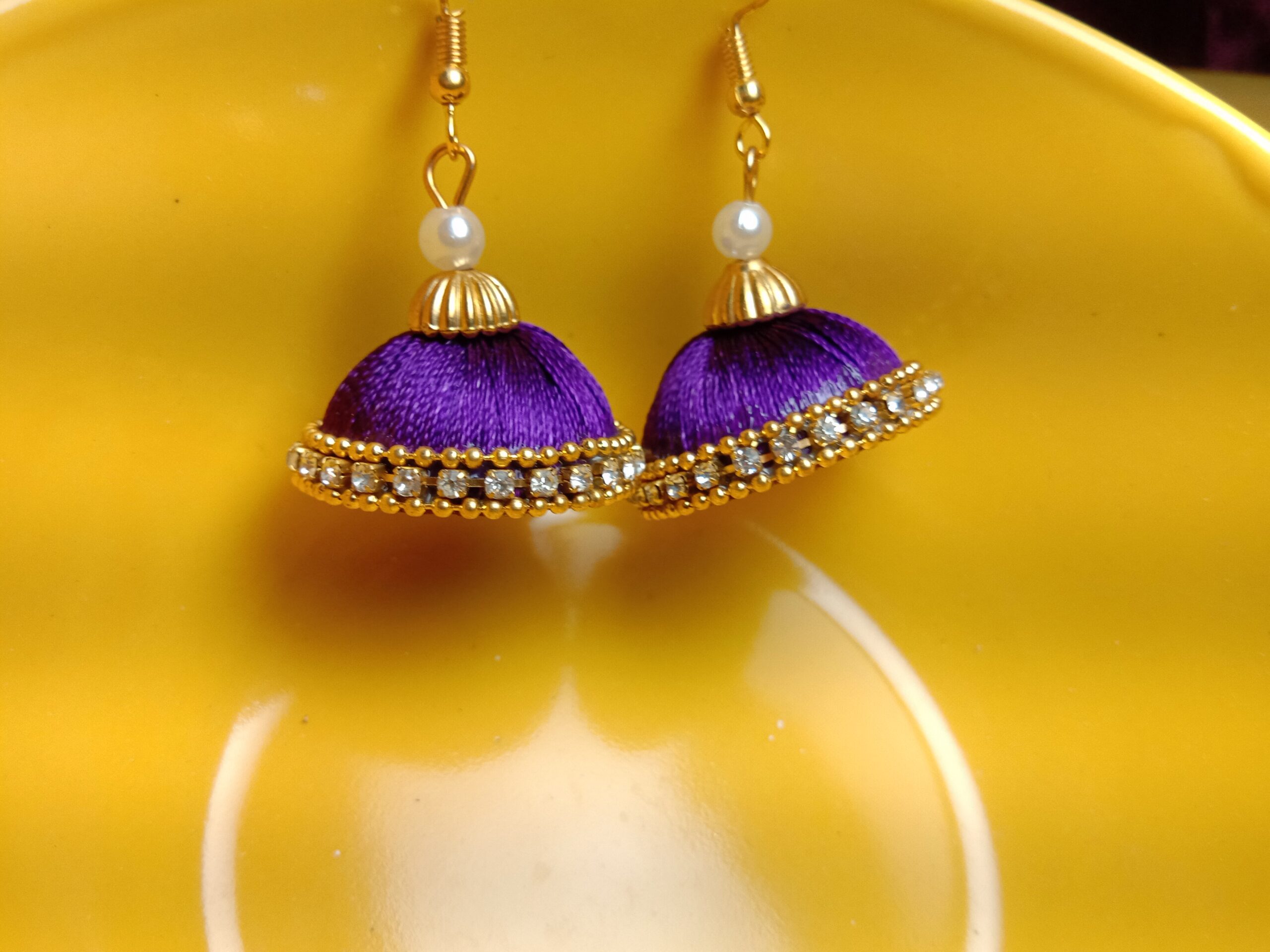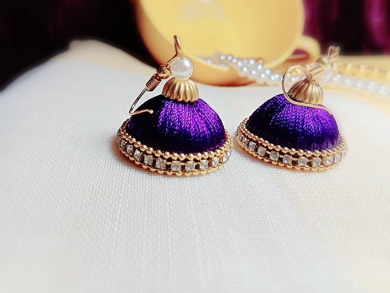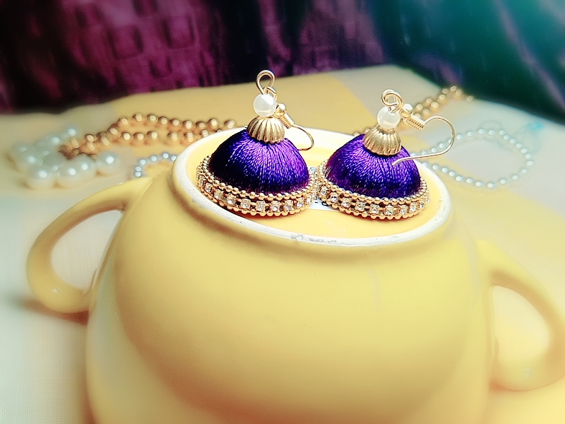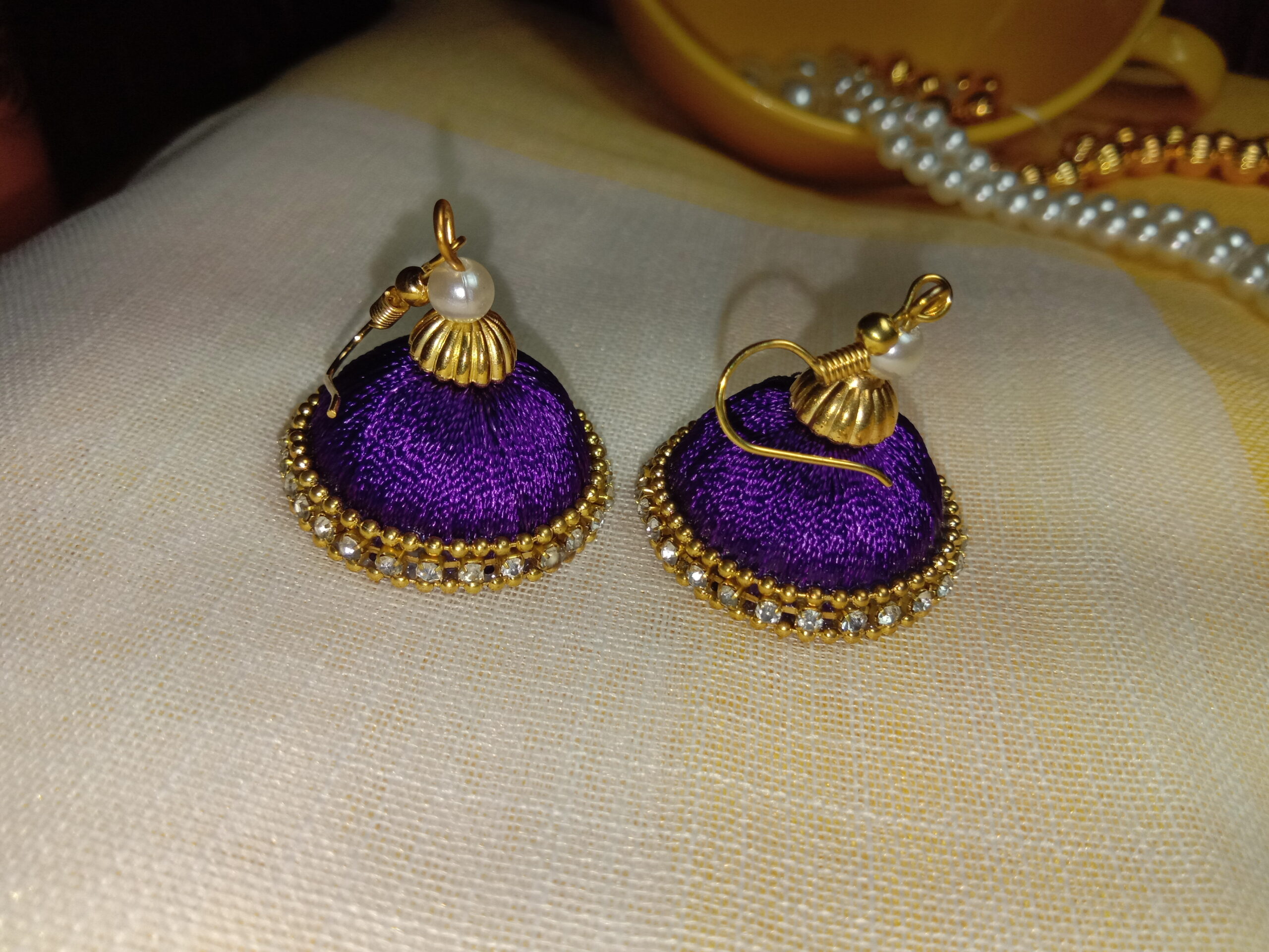 Be the first to review “Purple Silk Thread Medium Size Jhumkas With Diamond Lace & Double Golden Lace”