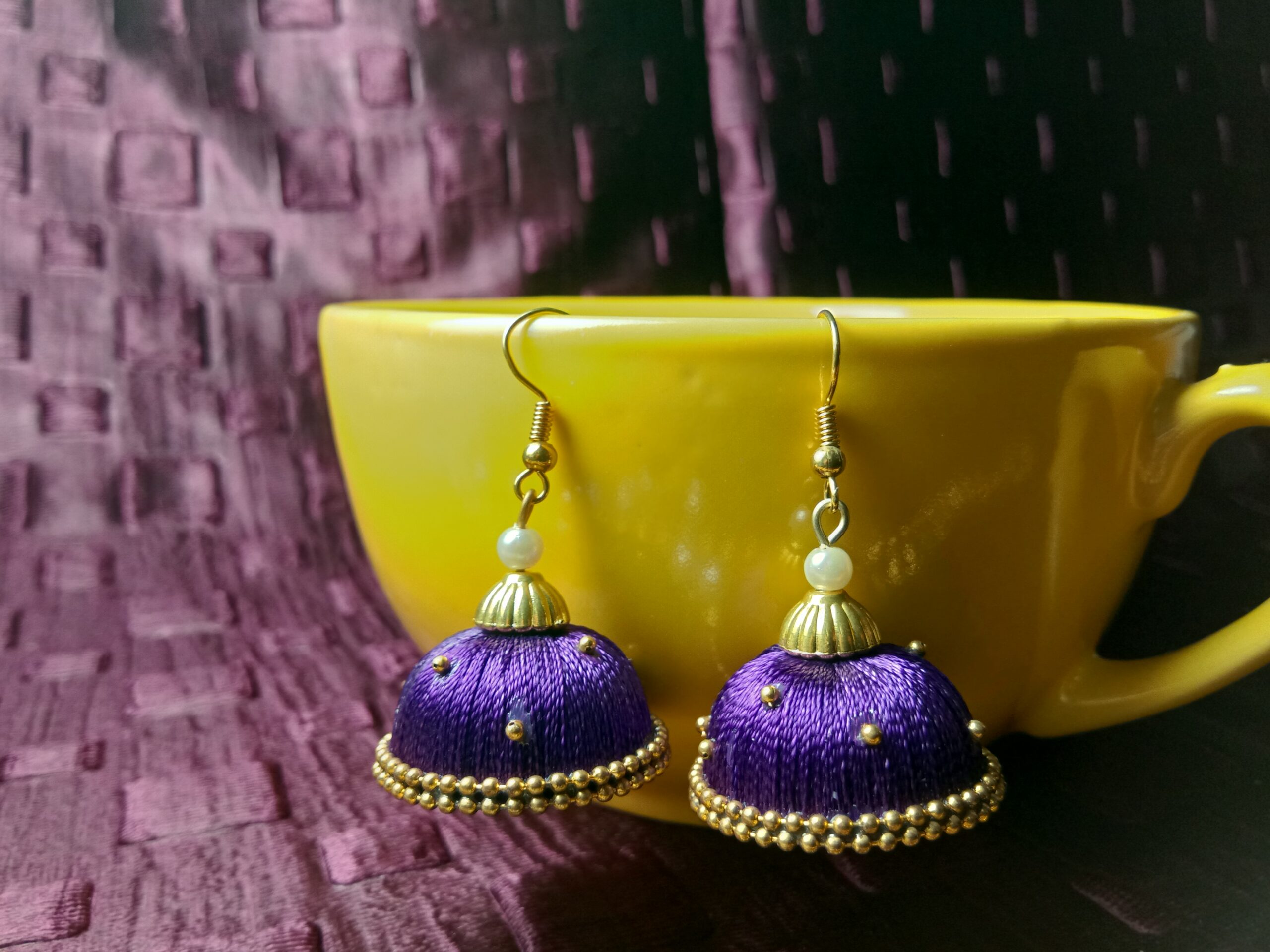 Be the first to review “Purple Silk Thread Medium Size Jhumkas With Double Golden Lace with Gold dots”