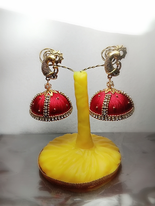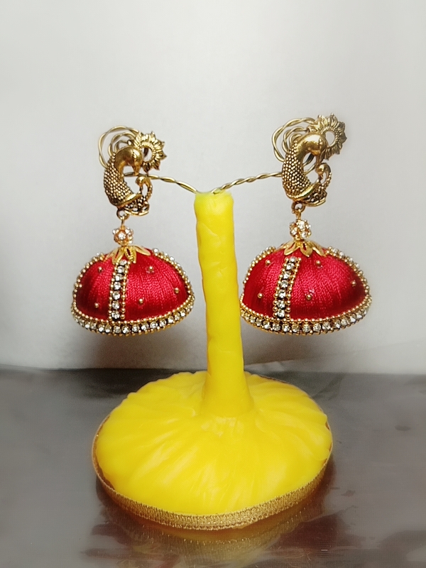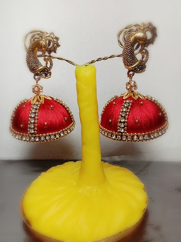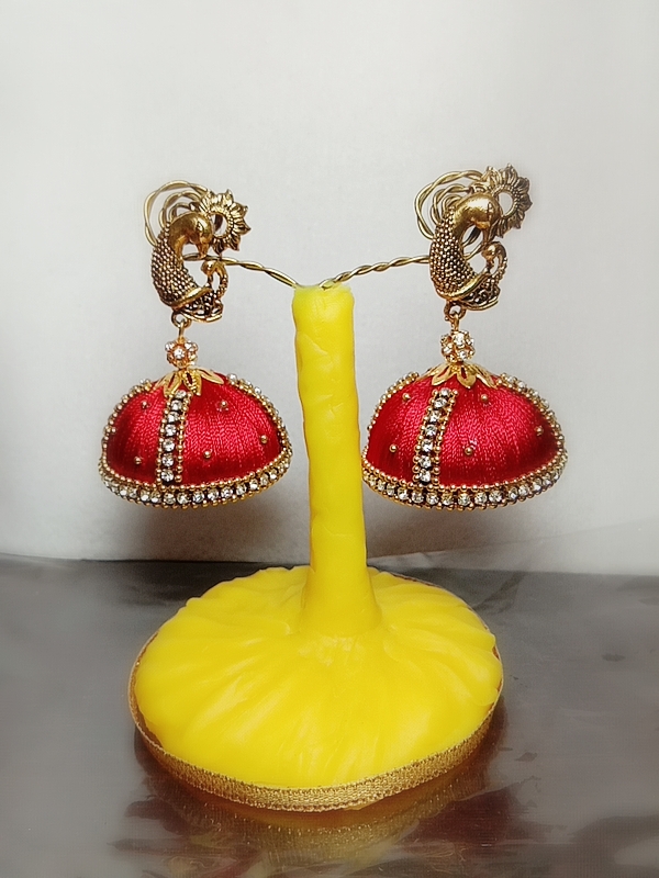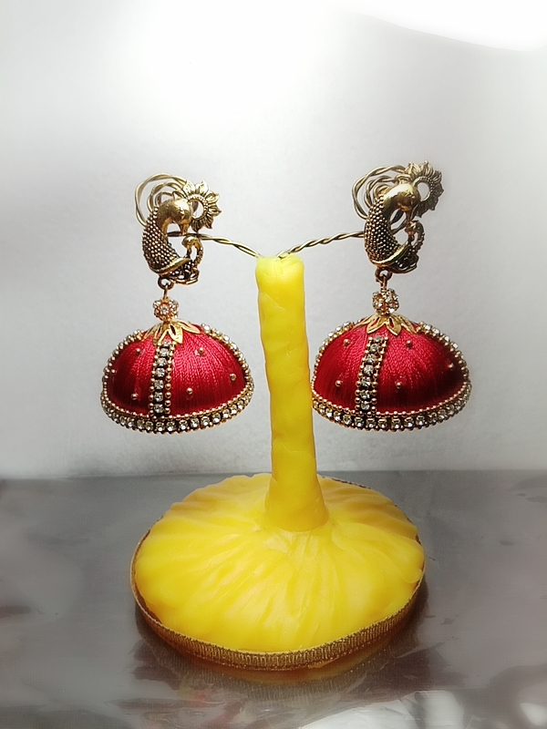 Be the first to review “Red Partyware Designer Heavy Silk Thread Big Size Jhumkas With Diamond & Golden Lace With Peacock Metal Stud”
