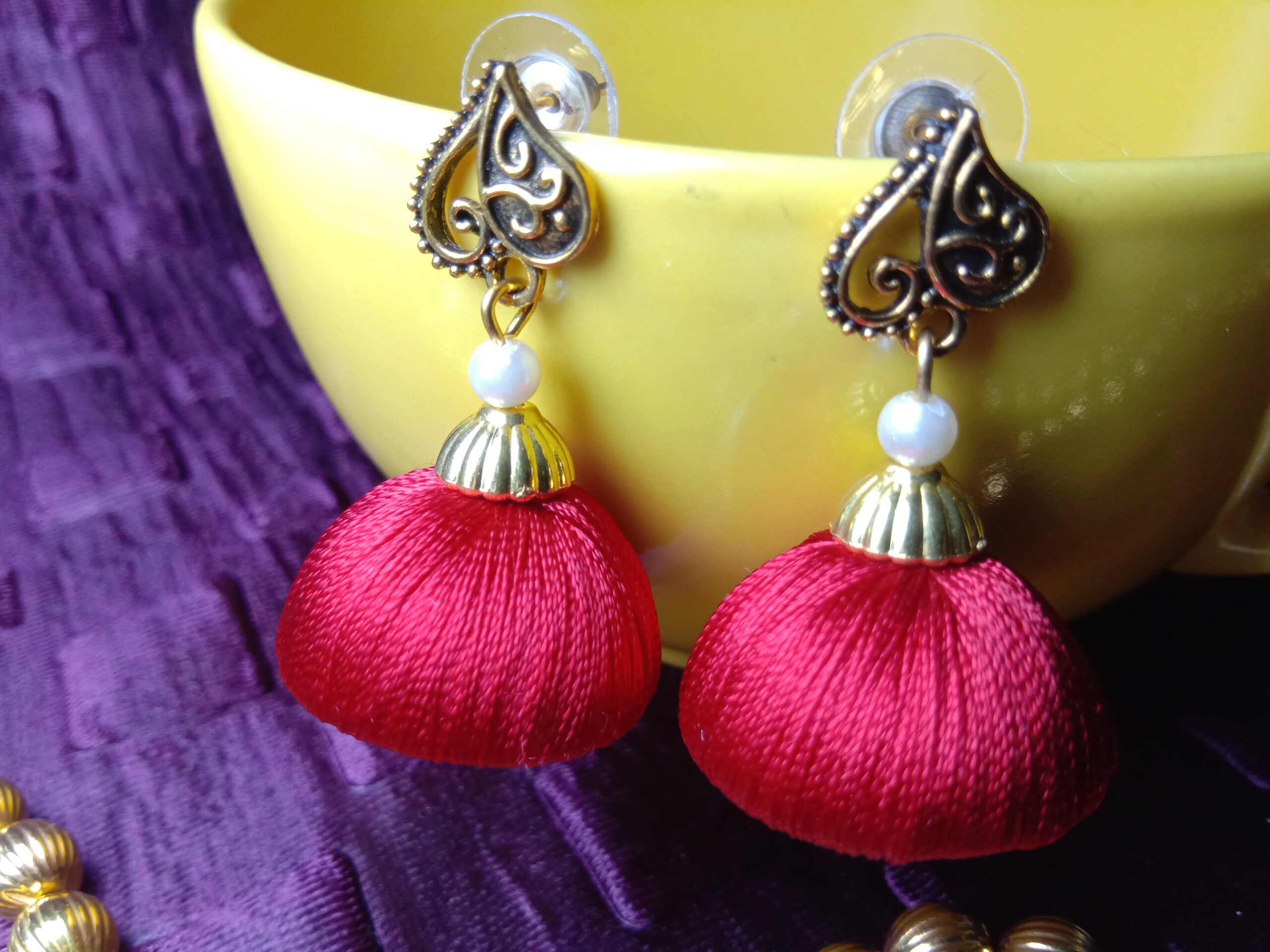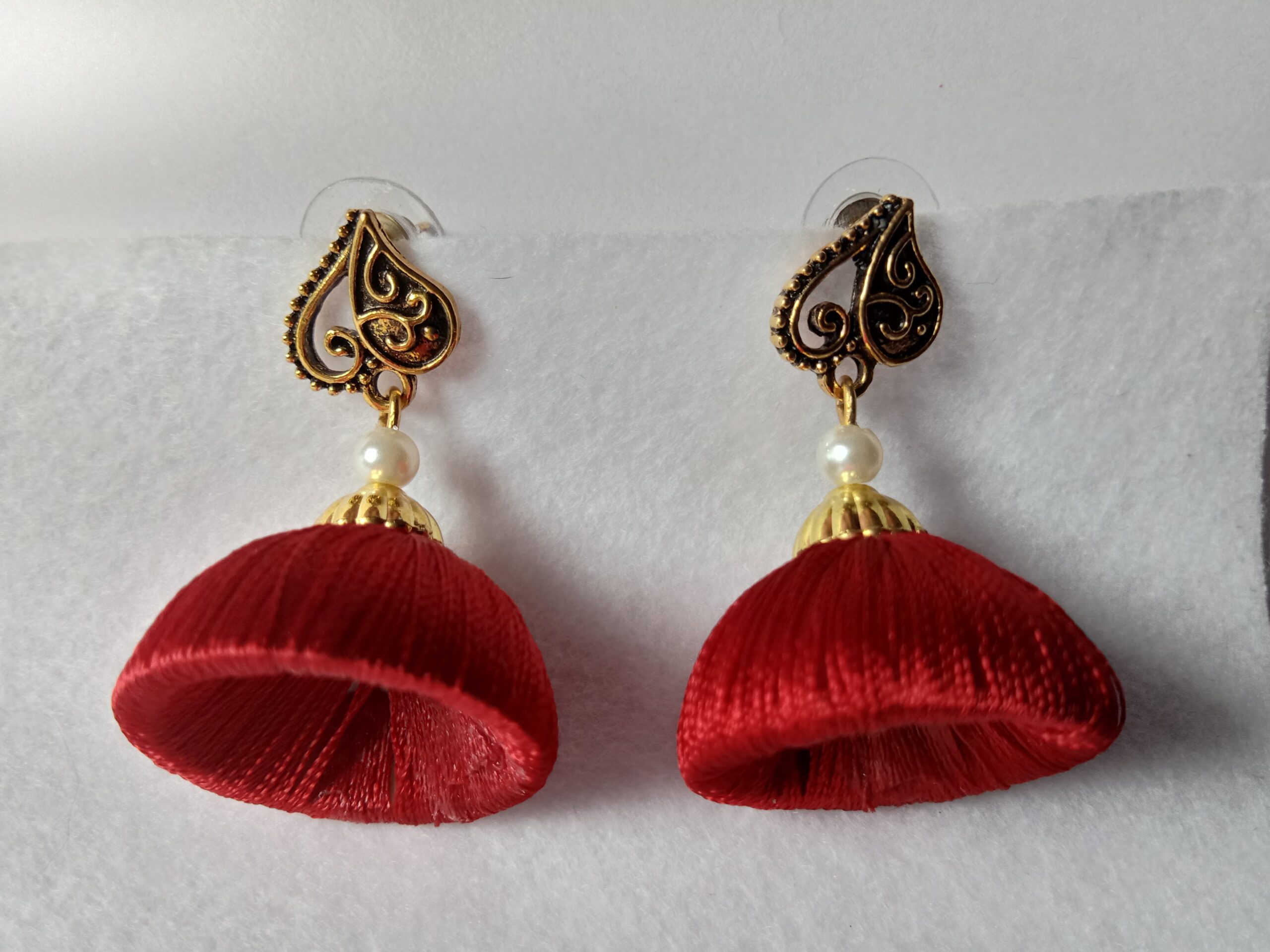 Be the first to review “Red Silk Thread Medium Size Jhumkas With Metal Heart Shape Brass Stud”