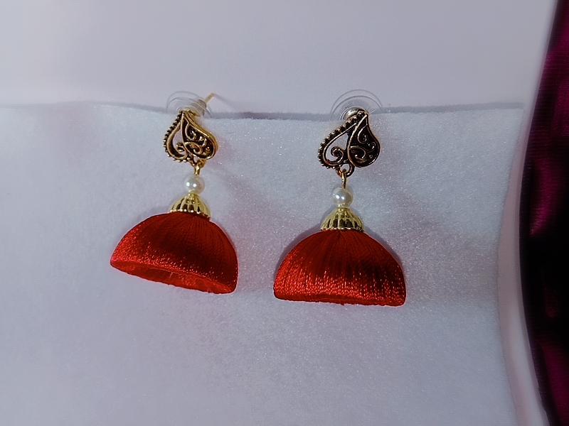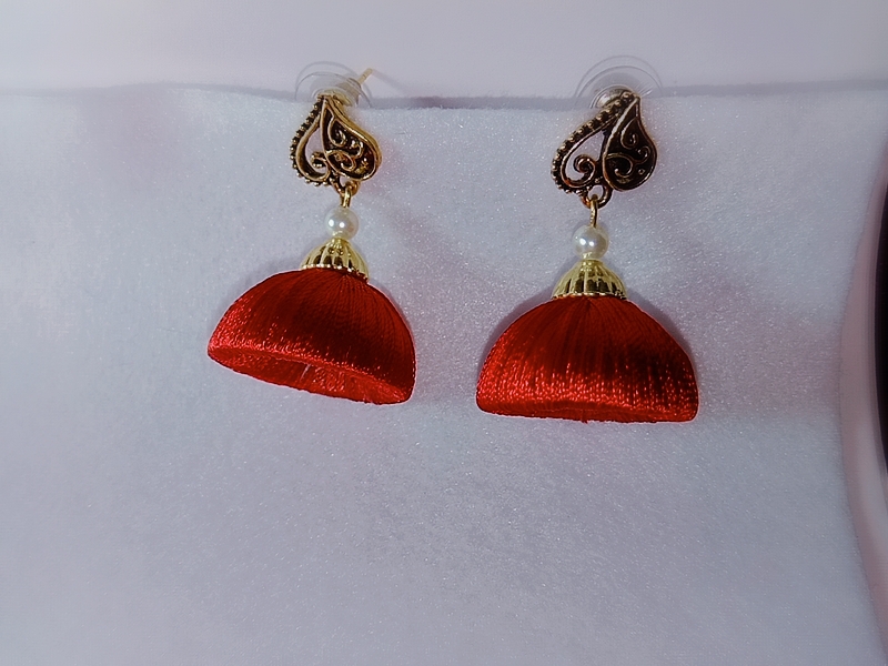 Be the first to review “Red Silk Thread Medium Size Jhumkas With Metal Heart Shape Brass Stud”